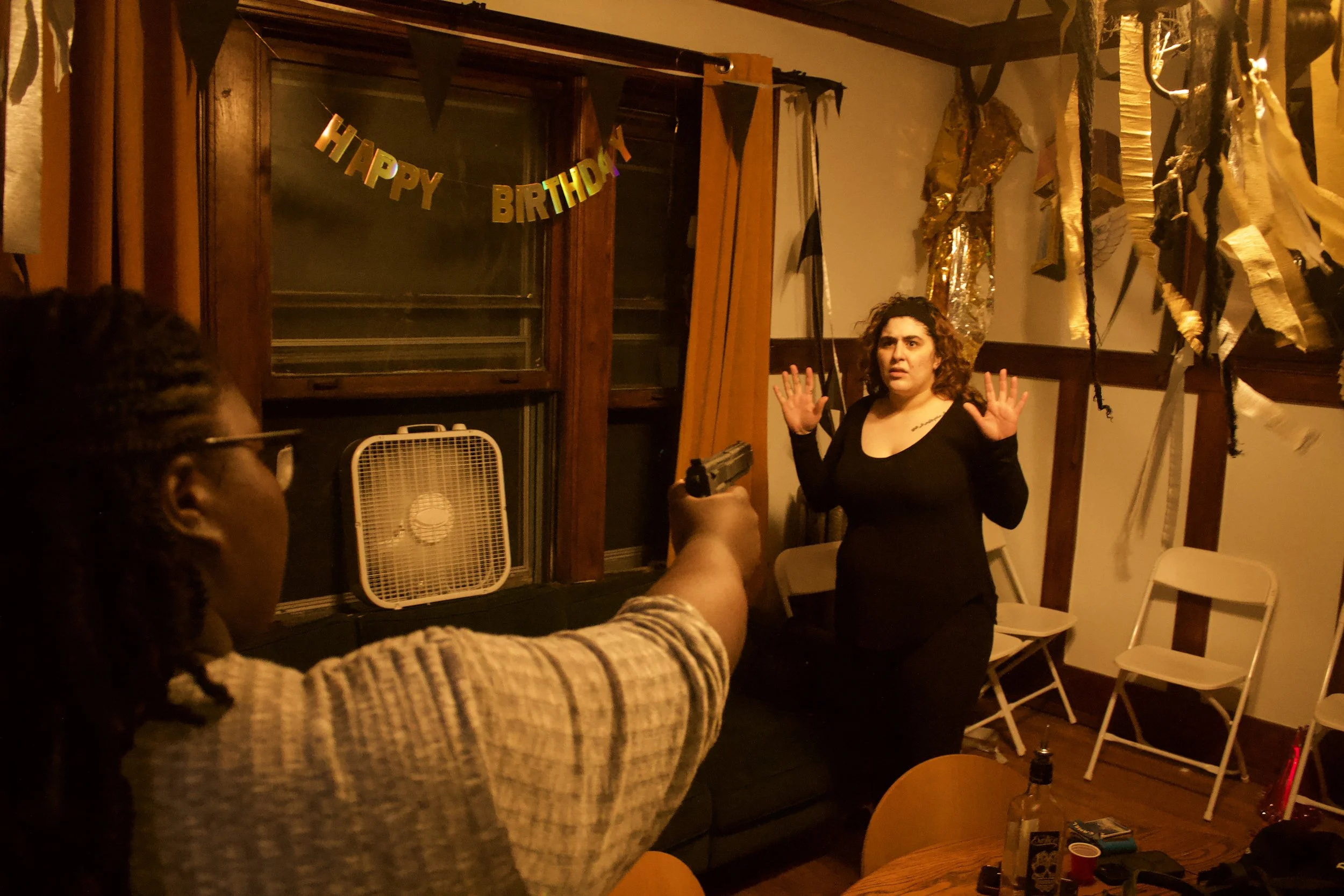 Niki (Helana Georgis) is held at gunpoint by her best friend’s mom, June (Ryan Stapleton), after surprising her in the empty apartment in the wake of a tragedy.